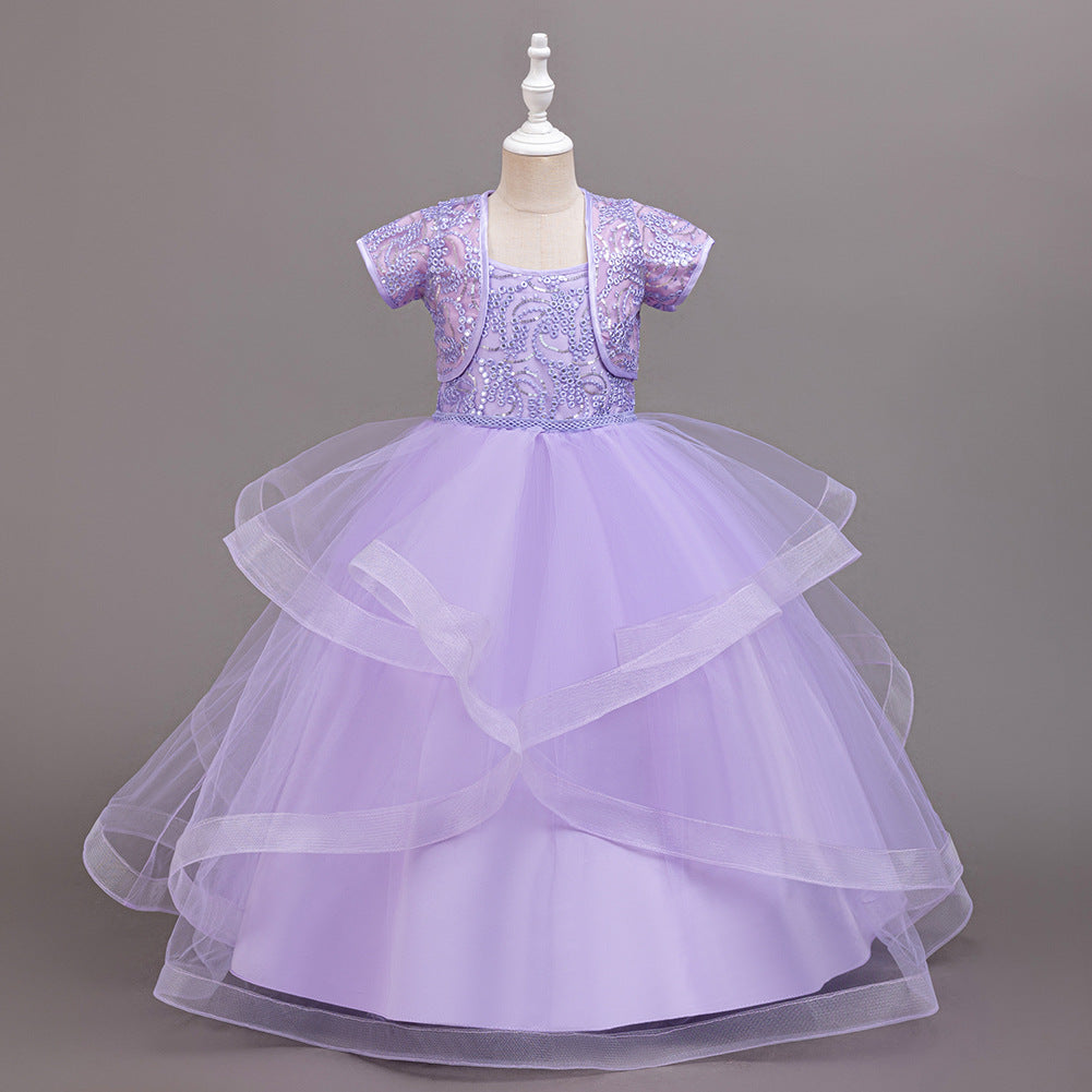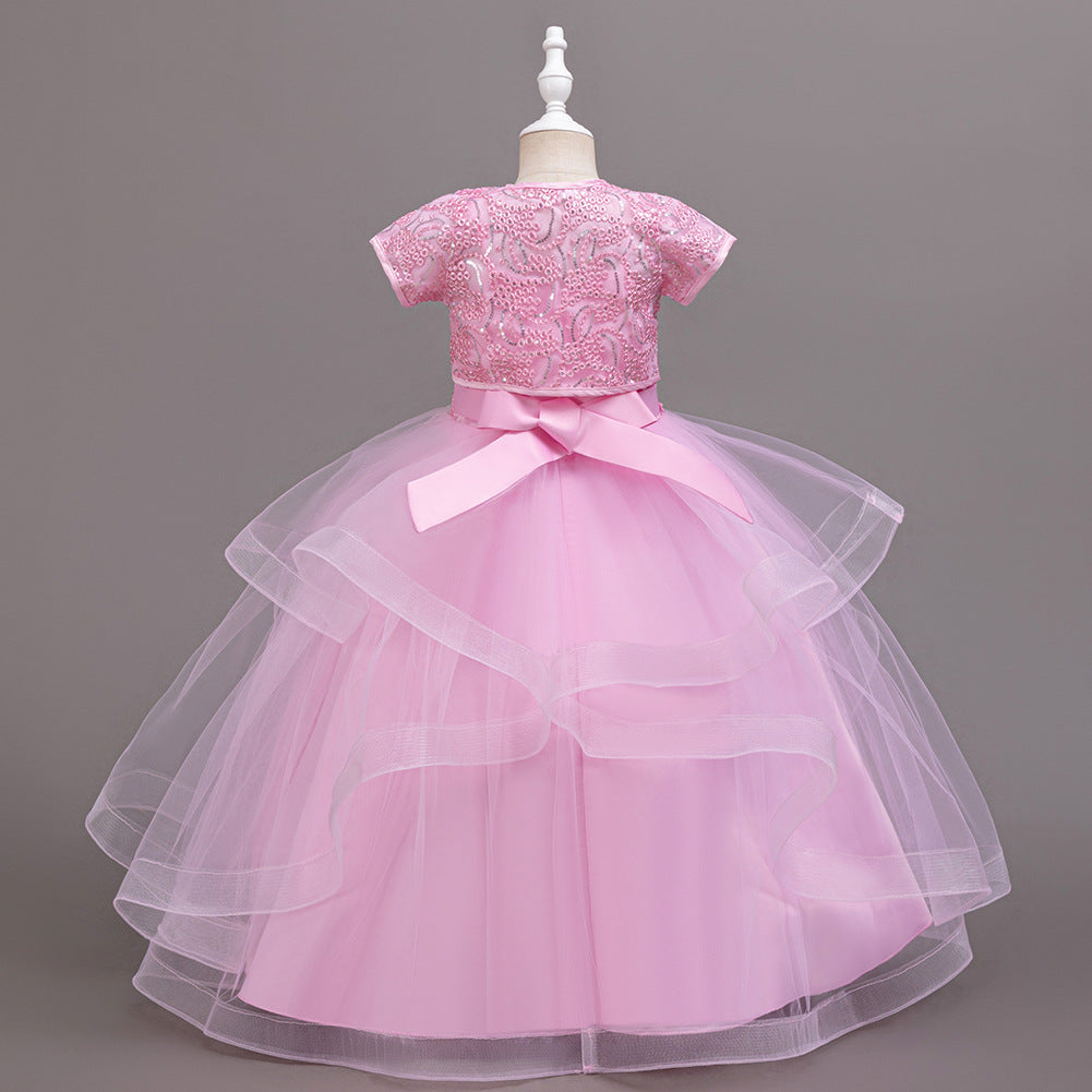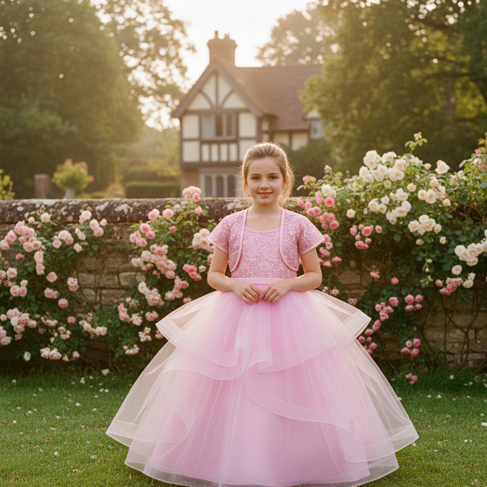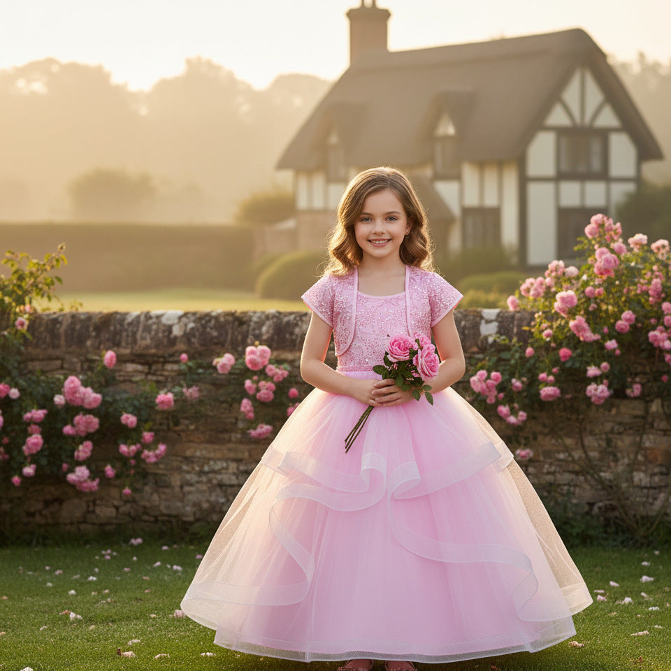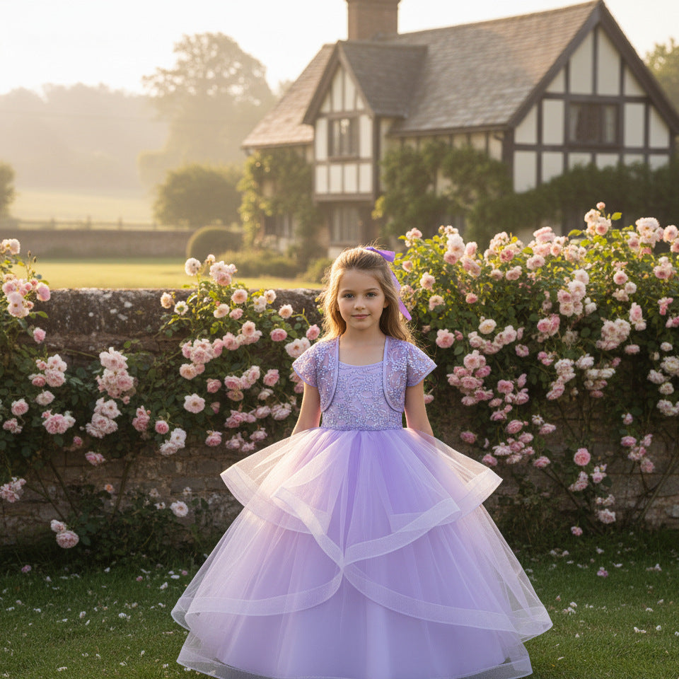 It is simple, but gorgeous and very classy. It is a full length gown, with a great amount of volume, but still comfortable to move and walk around in. Can be custom made in any color and up to size 8 years.