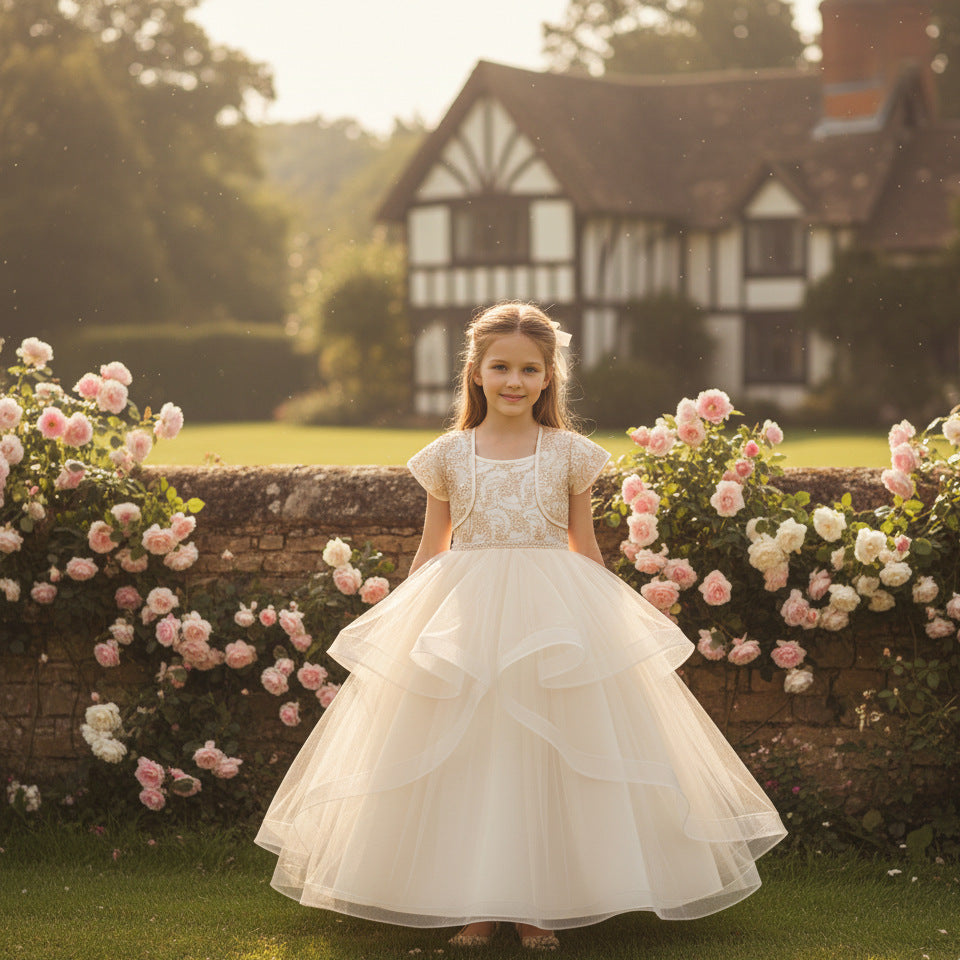 One of our best selling dresses for Flower Girls, Weddings, or any special event in general. We have found most parents love a classic, bow look, with light jewels and a lace overlay when it comes to the dresses they want for their flower girl.