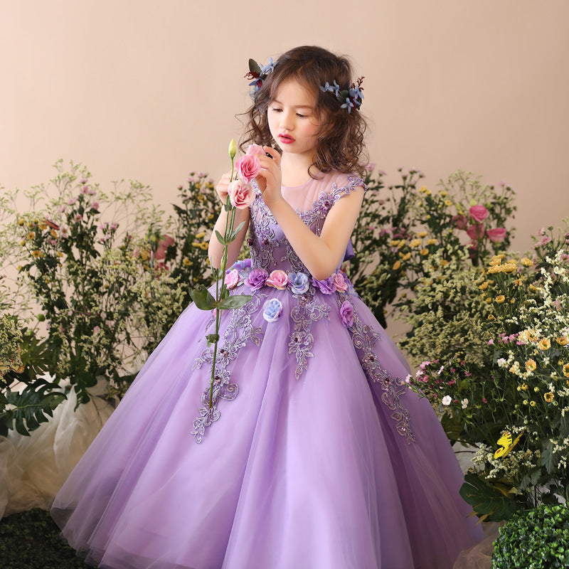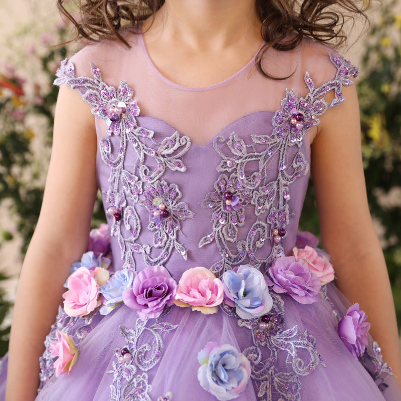 It is simple, but gorgeous and very classy. It is a full length gown, with a great amount of volume, but still comfortable to move and walk around in. Can be custom made in any color and up to size 12 years.