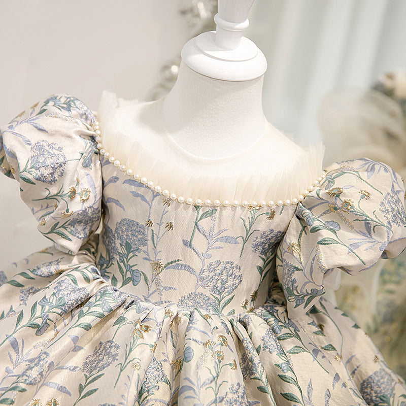 It is simple, but gorgeous and very classy. It is a full length gown, with a great amount of volume, but still comfortable to move and walk around in. Can be custom made in any color and up to size 12 years.